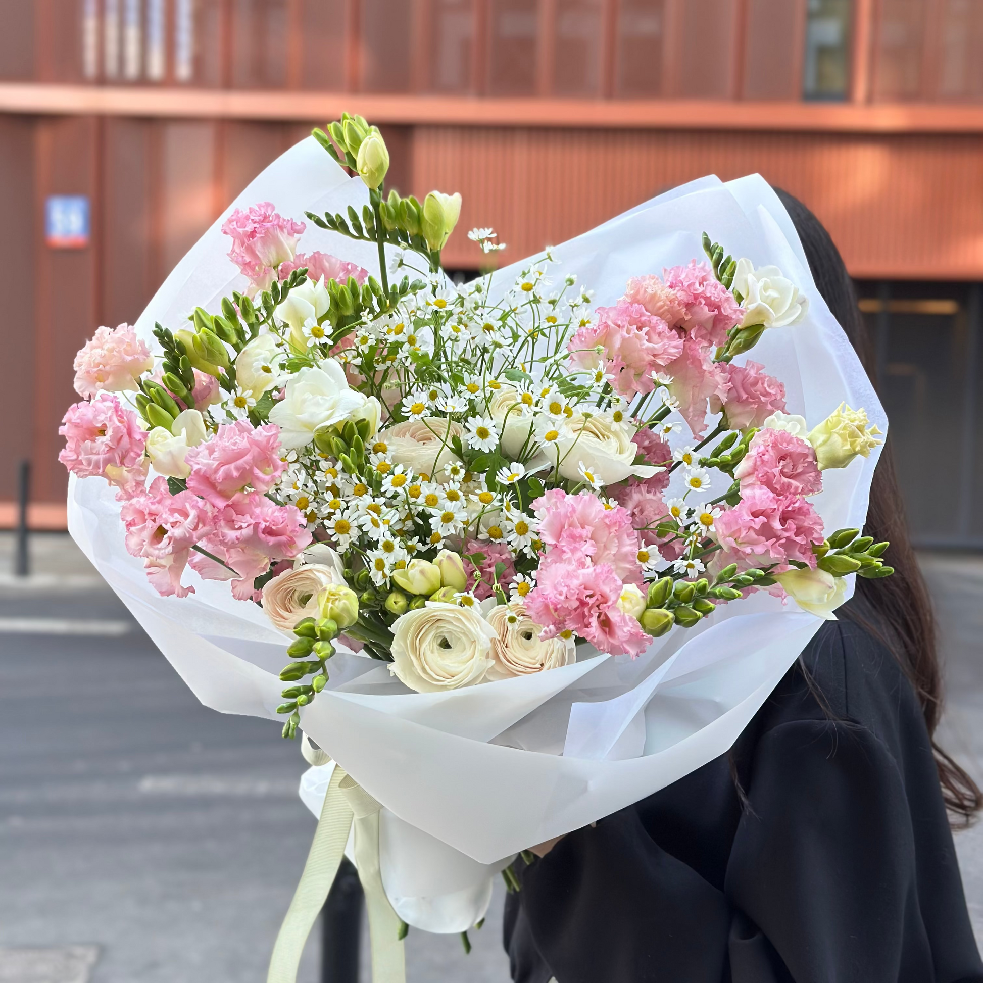 Lekki, żywy bukiet oddający nastrój ciepłego dnia poza miastem. Delikatne różowe eustomy i ranunculus przeplatają się z kremowymi akcentami, a rozrzucone stokrotki tworzą wrażenie naturalności i lekkości. Zielone linie frezji dodają dynamiki i świeżości, jakby lekki wiatr przechodził przez kwiaty.