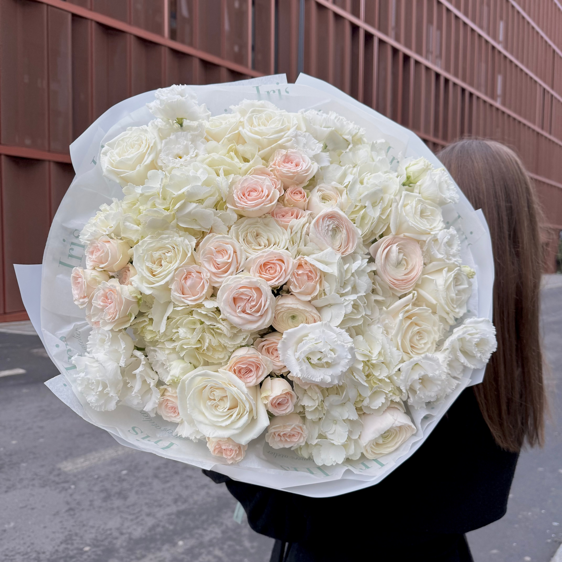 Ten monumentalny i dopracowany w odcieniach bukiet opiera się na szlachetnej gamie kolorów kości słoniowej i kremowej śmietanki z delikatnym rumieńcem w środku. Róże krzewiaste, zwiewna hortensja i eleganckie ranunculusy tworzą wrażenie uroczystości bez zbędnego przepychu — wszystko jest surowe i stonowane.