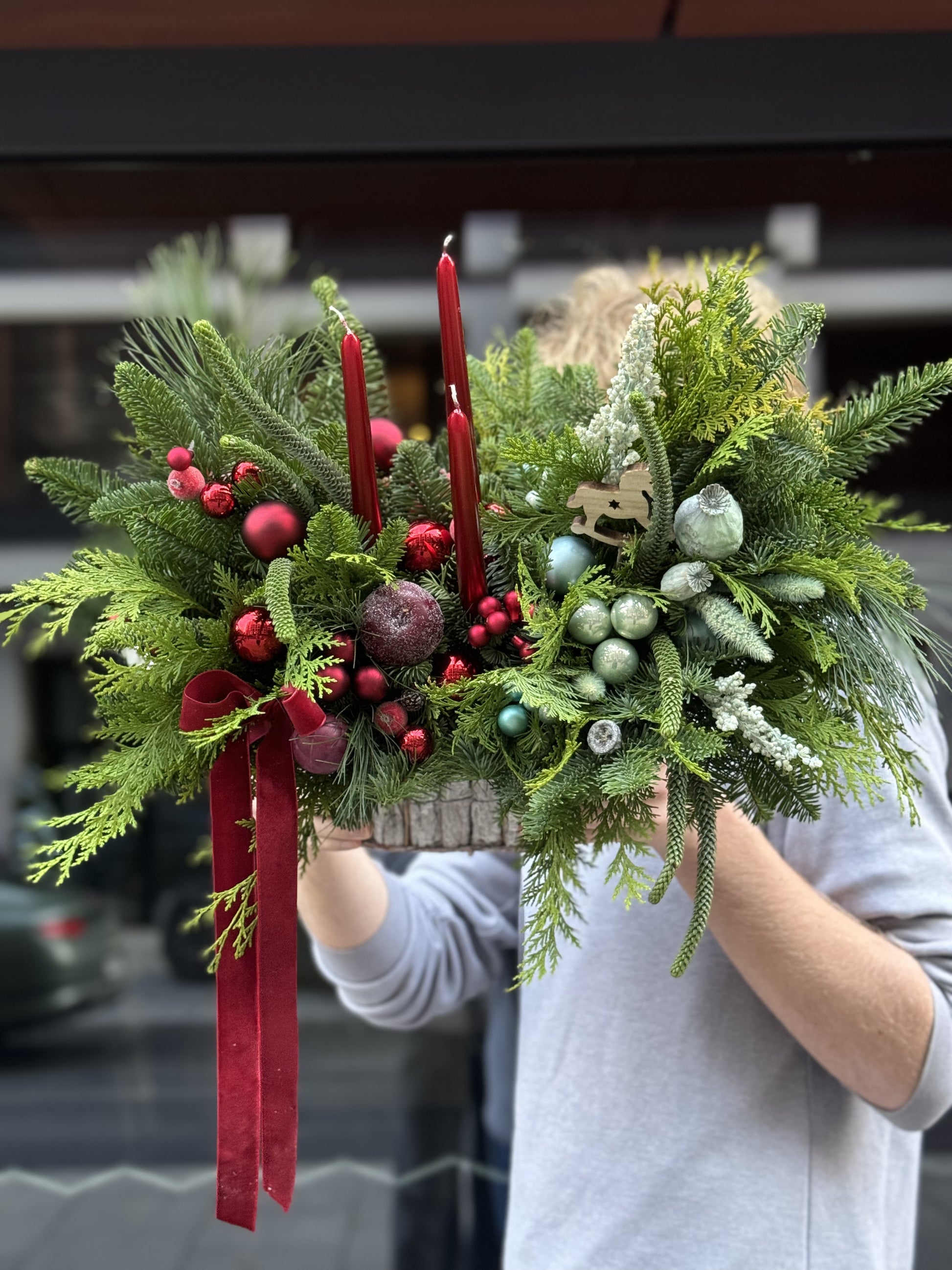 Winter composition is a true embodiment of the holiday mood. Filled with fragrant pine needles, fir cones, delicate accents of winter flowers and decorative elements, it gives a feeling of warmth and coziness. This composition will become a bright accent of your home or an ideal gift filled with an atmosphere of magic. It will maintain the holiday mood throughout the winter season and will be a great addition to a cozy corner or New Year's table.