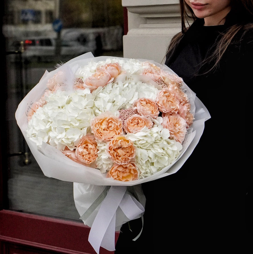 Bukiet Ivory — kompozycja z białych hortensji i brzoskwiniowych róż. Czyste odcienie i schludny kształt tworzą stonowany, jasny obraz. Uniwersalny wariant, gdy potrzebny jest spokojny i elegancki bukiet.