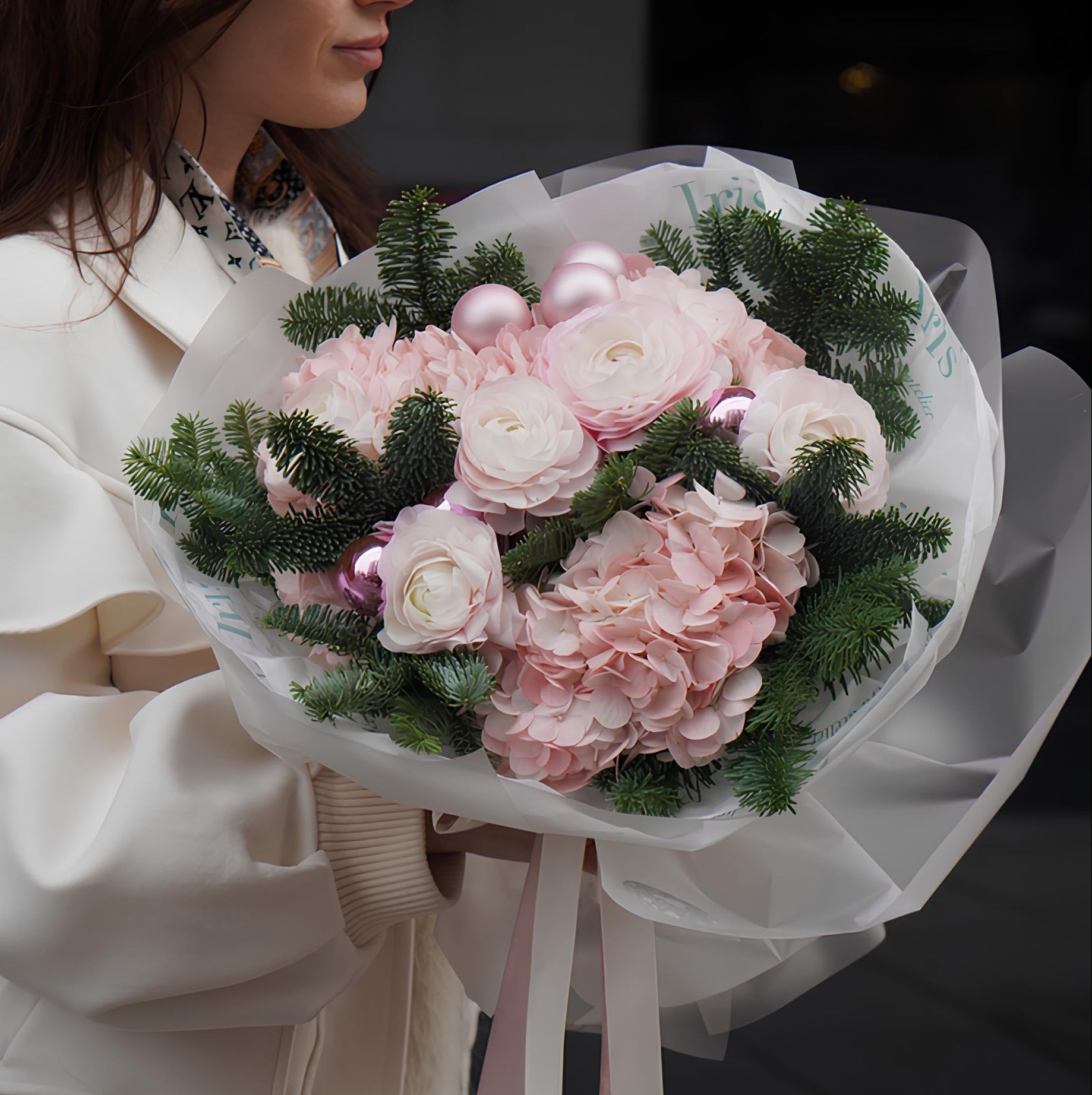 Bukiet Rosepine łączy delikatne różowe odcienie ranunculusów i hortensji w połączeniu ze świeżą igłą sosnową. Delikatne kształty kwiatów i gęsta zieleń tworzą czysty zimowy nastrój z lekkim różowym akcentem. Jest to kompozycja, w której świeżość sezonu spotyka się z delikatnością i ciepłem.