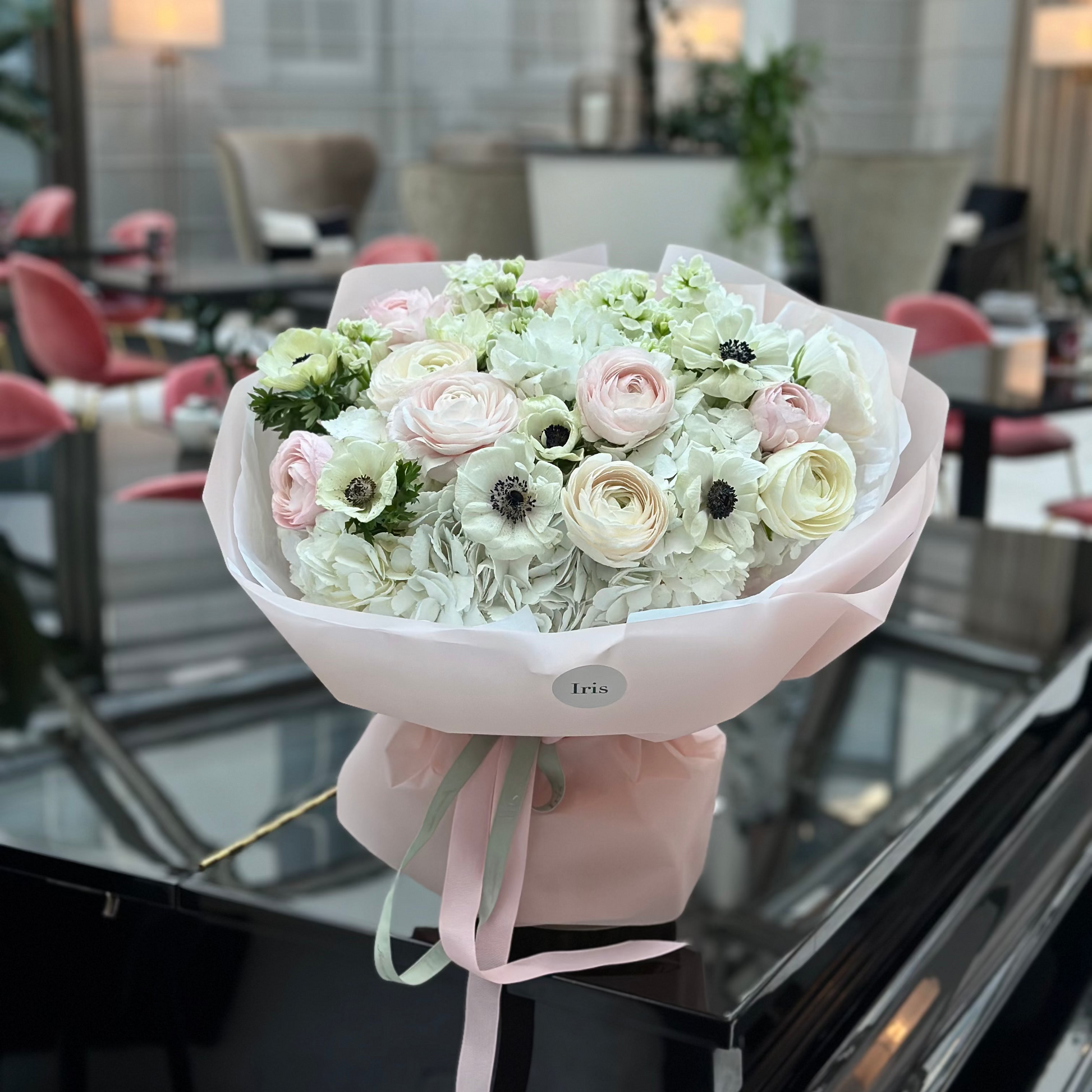 Bukiet Triumph — luksusowa kompozycja z ranunculusów, anemonów, matthioli i hortensjiw jasnej, wyrafinowanej palecie barw. Objętościowe kwiatostany i wyraziste formy tworzą wrażenie statusu i nienagannego gustu.
