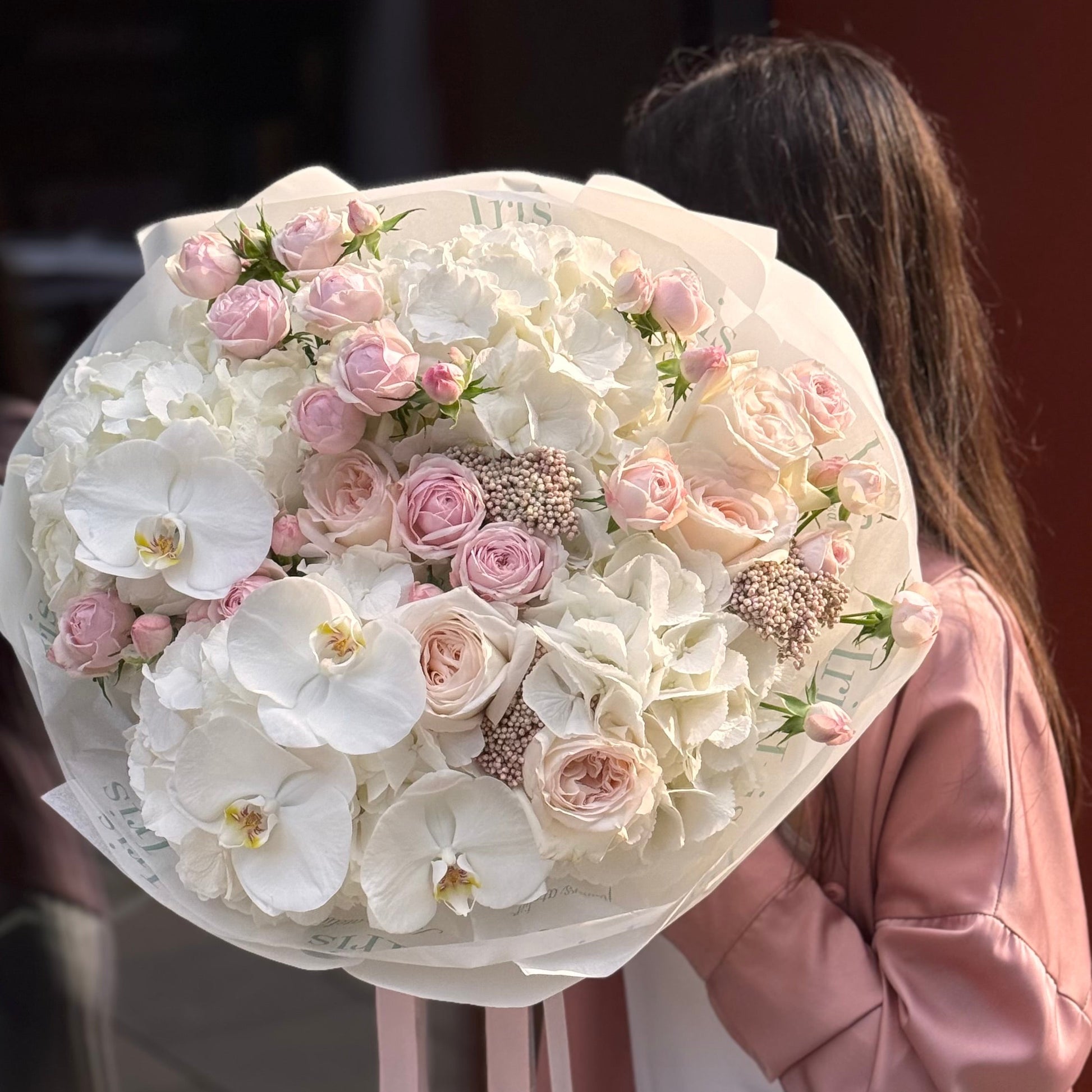 Букет Golden Hour — изысканная композиция из белоснежных орхидей, воздушной гортензии и нежных кремово-розовых роз. Лепестки впитывают нежное золото заходящего солнца, превращая каждый цветок в крошечное сияние. Этот букет словно мгновение золотого часа — тёплое, чарующее и незабываемое.