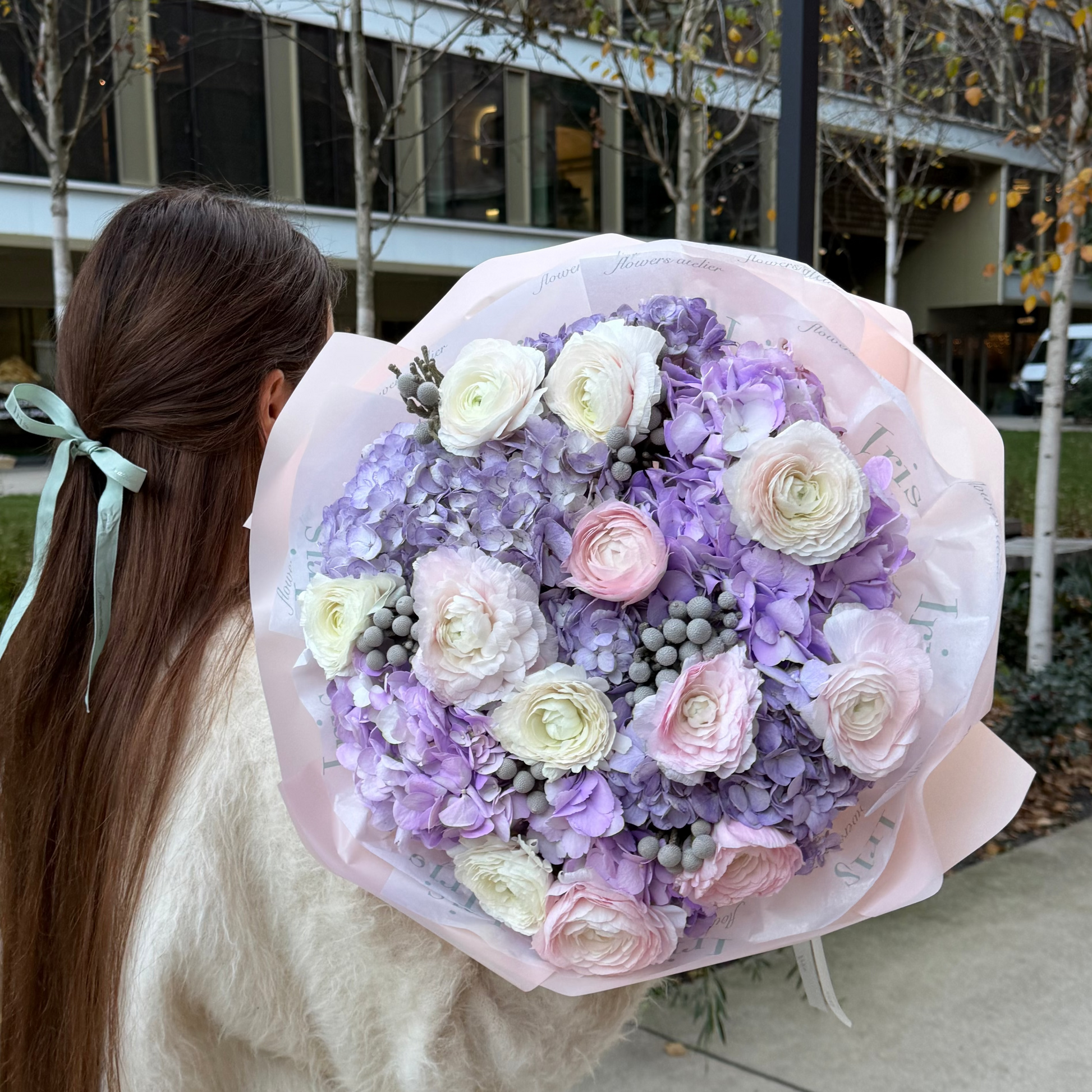 Букет Plum, составленный в яркой фиолетовой гамме, сочетает в себе ранункулюсы и гортензии, собранные в плотную, тщательно подобранную композицию. Цвет и текстура приглушенные, но выразительные, что создает композицию с характером и изящной глубиной.